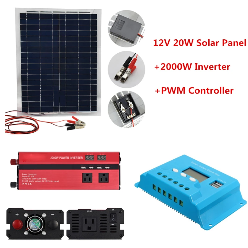 Cheap Price of 12V 20W Solar Panels with 2000W Car Inverter 12V 24V to 220V 110V and 10A 20A 30A PWM Solar Control